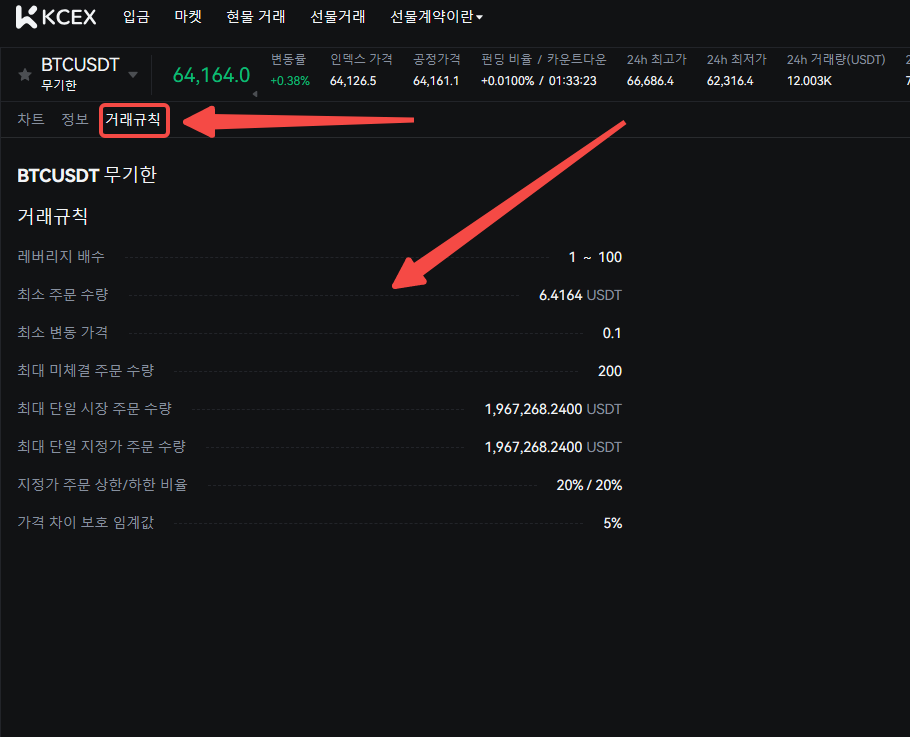 선물 거래 화면에서 오른쪽에 있는 안내 기호 클릭하시면 해당 거래 페어의 세부 사항을 확인할 수 있습니다. 시장 리스크 조건에 따라 KCEX는 거래 페어의 세부 사항을 조정할 수 있습니다. 즉, 펀딩 비율, 최소 변동 가격, 레버리지, 유지 보증금 비율, 포지션 제한 등 매개변수를 조정할 수 있습니다.