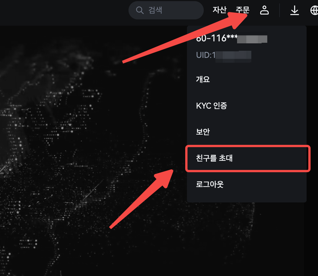 먼저, KCEX 플랫폼에 로그인하신 후, 우측 상단의 "개인센터"를 클릭하신 후 "친구 초대"를 선택하시면 KCEX 초대 대시보드로 진입하실 수 있습니다.