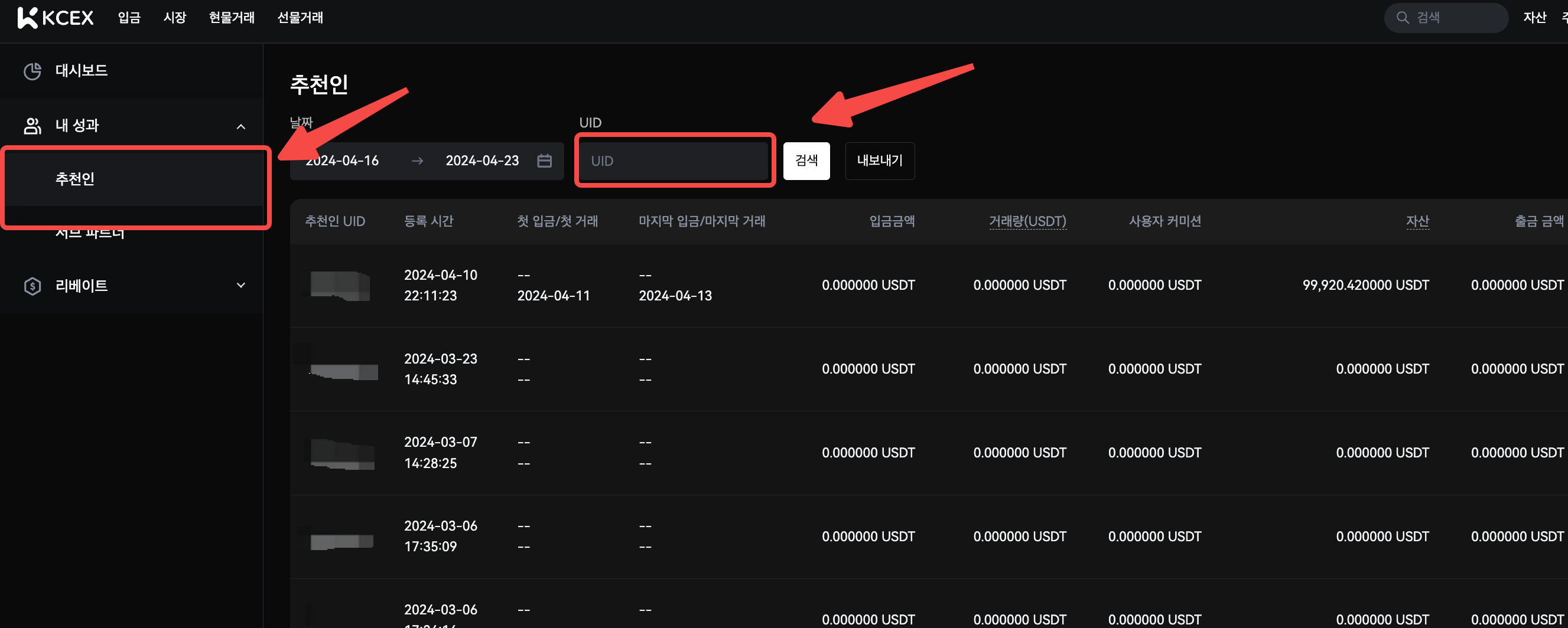 이 영역에서는 고객 번호, 예금 및 거래 데이터를 포함하여 커미션 상태를 포괄적으로 볼 수 있습니다. 이 정보는 성과 추세를 추적하고 판촉 전략을 최적화하는데 도움이 됩니다. 또한 오른쪽 상단에서 특정 날짜를 선택하여 관련 데이터를 보고, 내보내기 기능을 사용하여 추가 분석 및 보고를 위해 이러한 데이터를 저장할 수 있습니다.