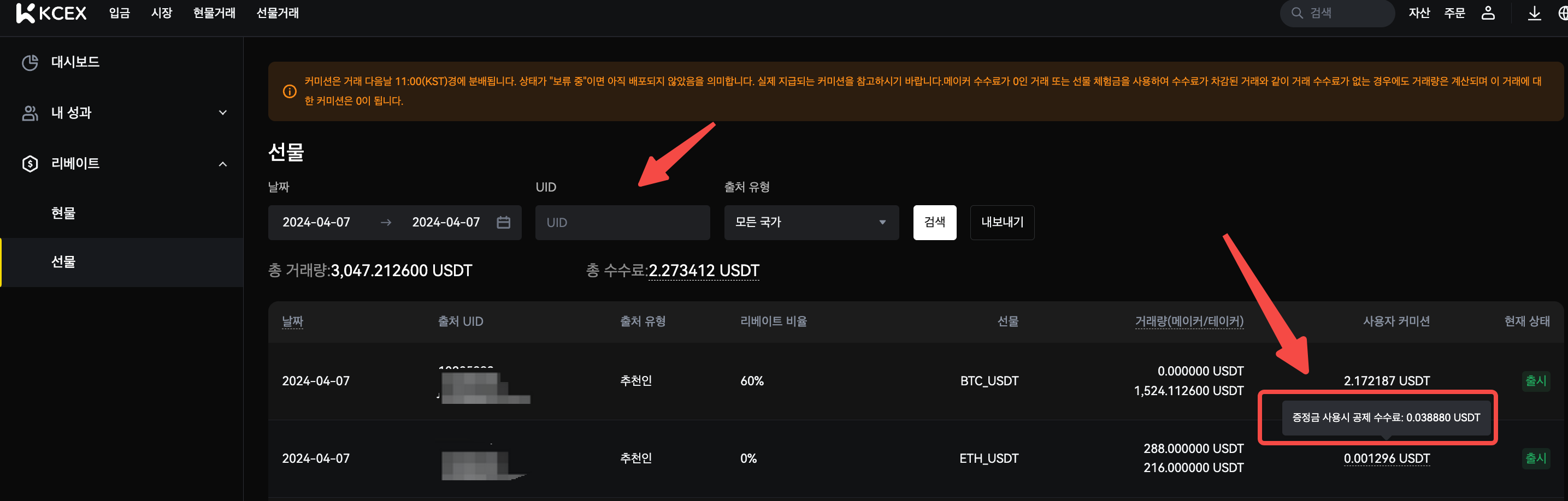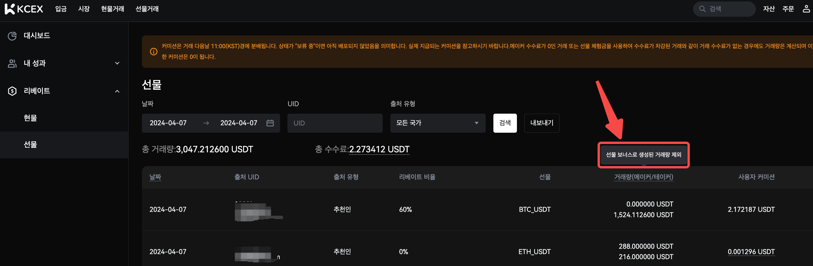 선택한 기간 동안 고객이 생성한 수수료 및 거래량을 확인할 수 있습니다.