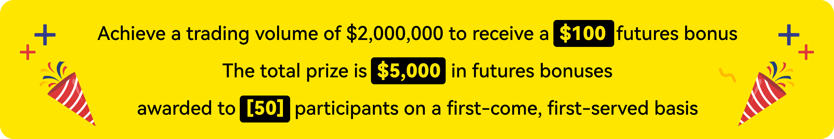 · A total trading volume of $2,000,000 will earn a $100 futures bonus. The total prize is $5,000 in futures bonuses, distributed to [50] people on a first-come, first-served basis.