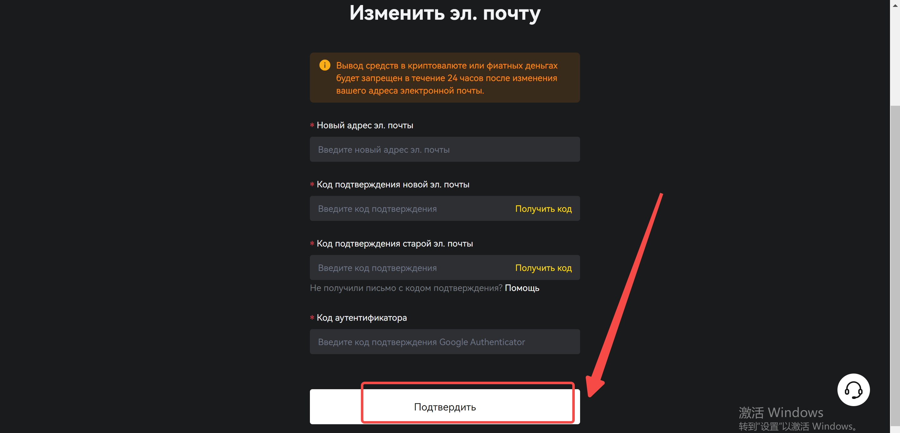 3. Введите свой новый адрес электронной почты, новый код подтверждения электронной почты, старый код подтверждения электронной почты и код подтверждения Google/код подтверждения по SMS, затем нажмите [Подтвердить], чтобы завершить процесс изменения.