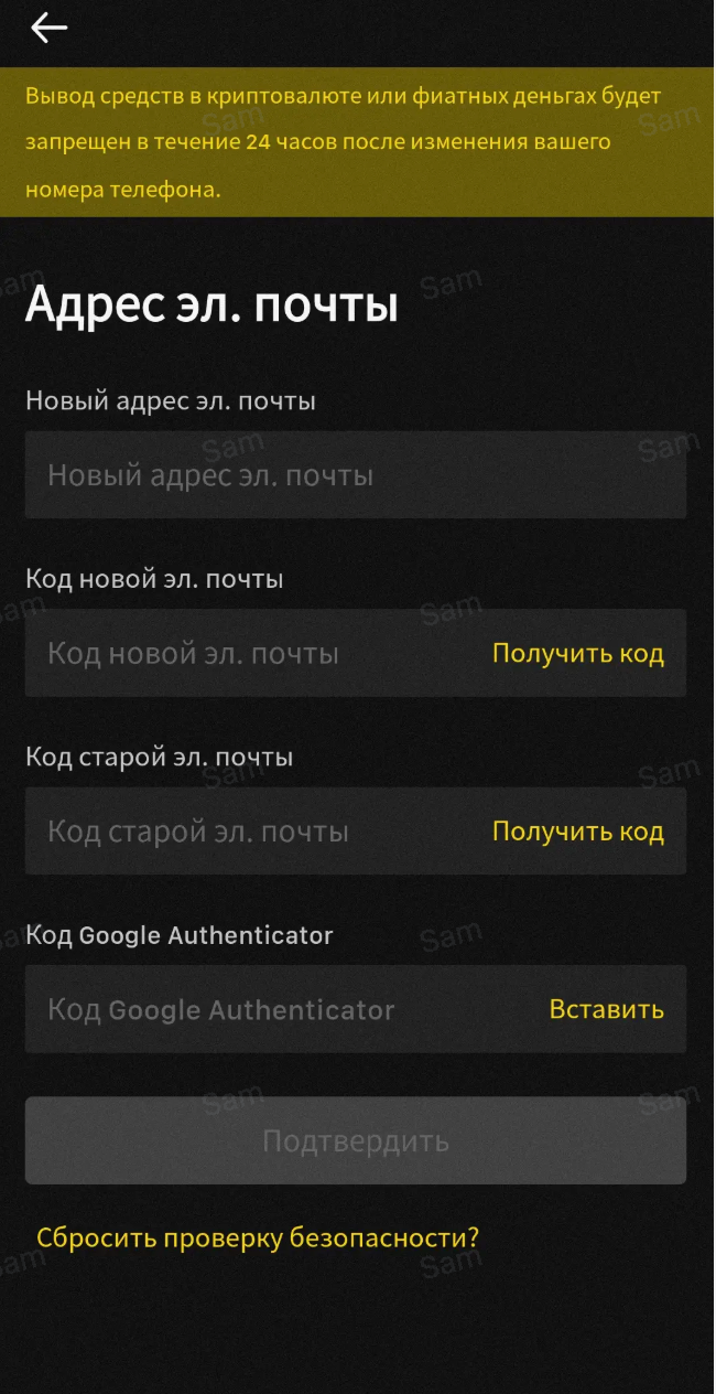 4. Введите ваш новый адрес электронной почты, новый код подтверждения электронной почты, старый код подтверждения электронной почты и код подтверждения Google/SMS, затем нажмите, чтобы завершить процесс изменения.