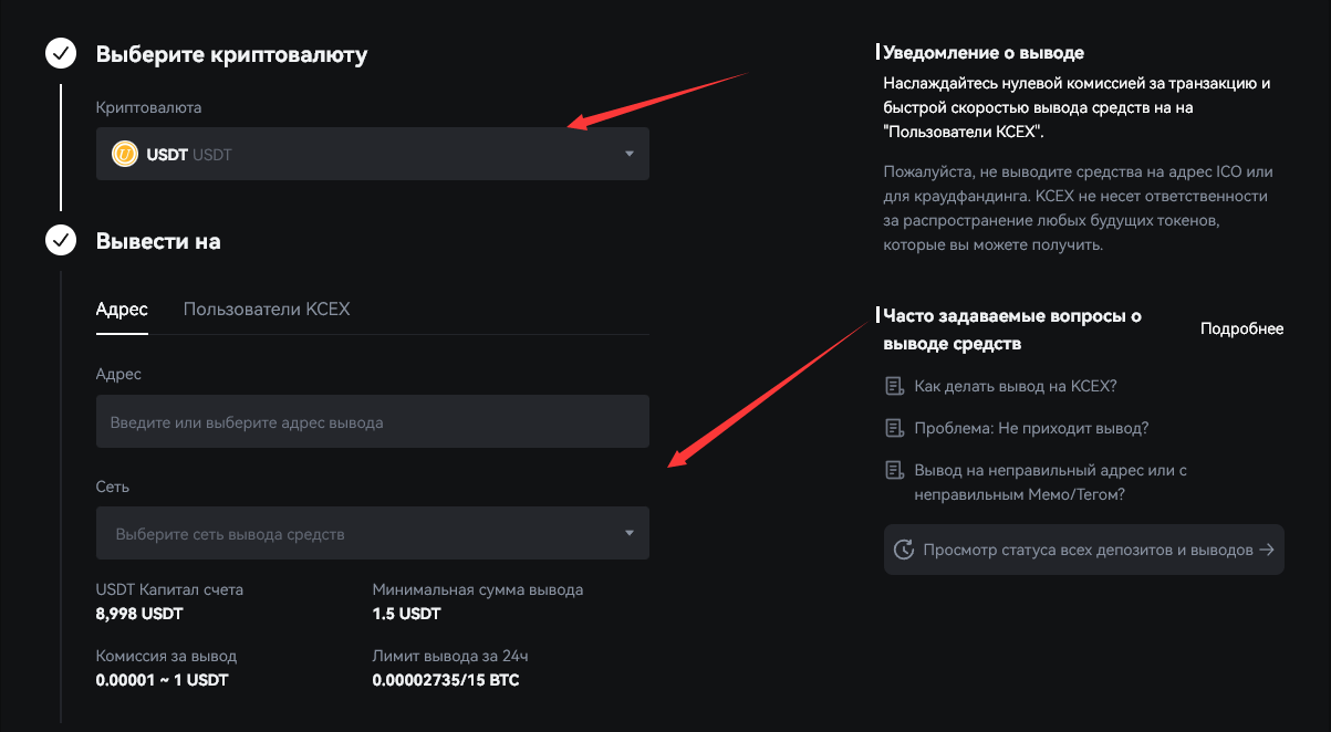 2. Выберите криптовалюту, которую хотите вывести, и сеть вывода, затем введите адрес вывода. ( Убедитесь, что выбранная сеть вывода средств соответствует сети вашего адреса получения. )