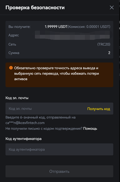 4. Подтвердите вывод средств [адрес], введите код подтверждения электронной почты и код аутентификации Google. После подтверждения данных нажмите [Подтвердить].