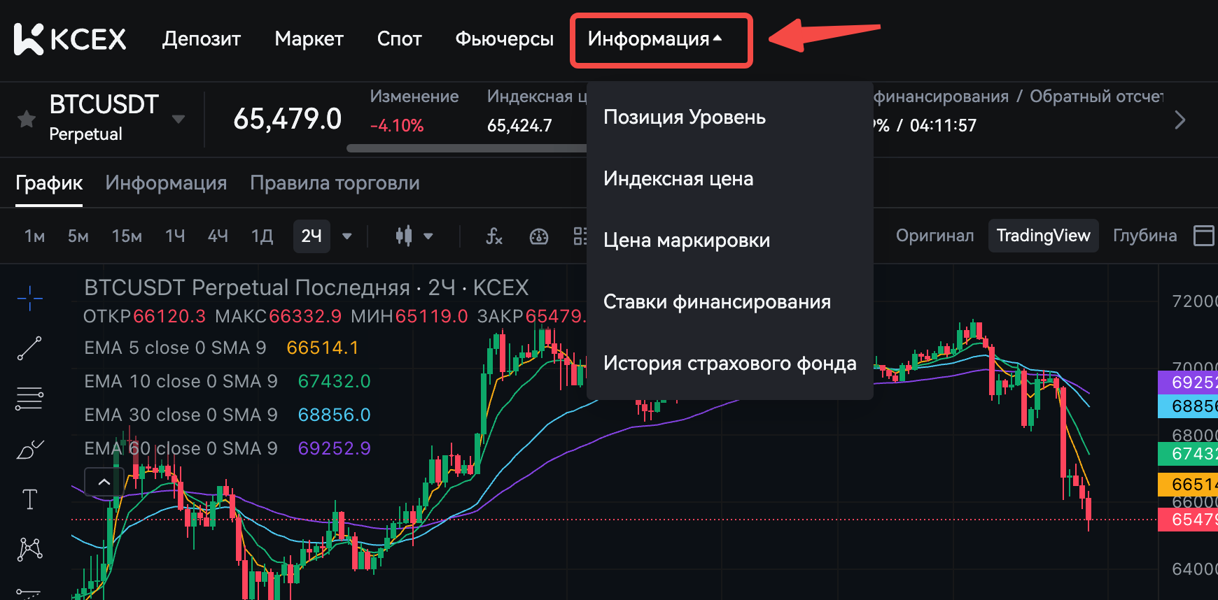 Вы можете узнать больше о спецификациях соответствующей торговой пары, нажав на символ справки справа в интерфейсе торговли фьючерсами.