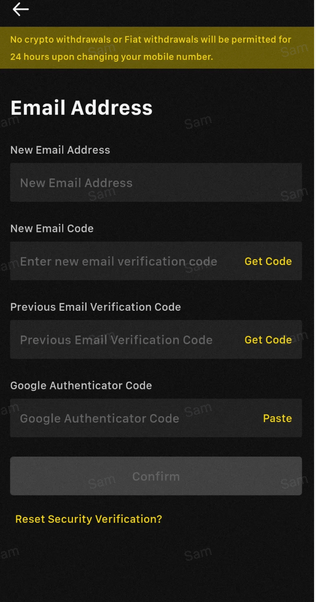 3. Fill in your new email address, new email verification code, old email verification code and google verification code/sms verification code, then click [Confirm] to complete the change process.