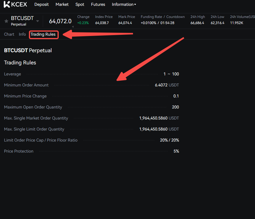In the futures trading interface, you can view the specifications for the corresponding trading pair in the prompt symbol on the right side. Depending on market risk conditions, KCEX may adjust the specifications of the trading pair, including funding rates, minimum price fluctuations, maximum leverage, initial margin, maintenance margin, and other crucial parameters.