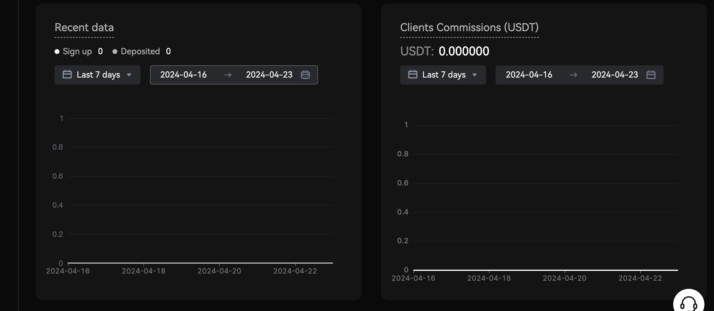 The charts displayed here provide you with the trends of client registrations and deposits, as well as the commissions you have earned. By selecting different date ranges, you can easily observe how your promotional efforts change over time.