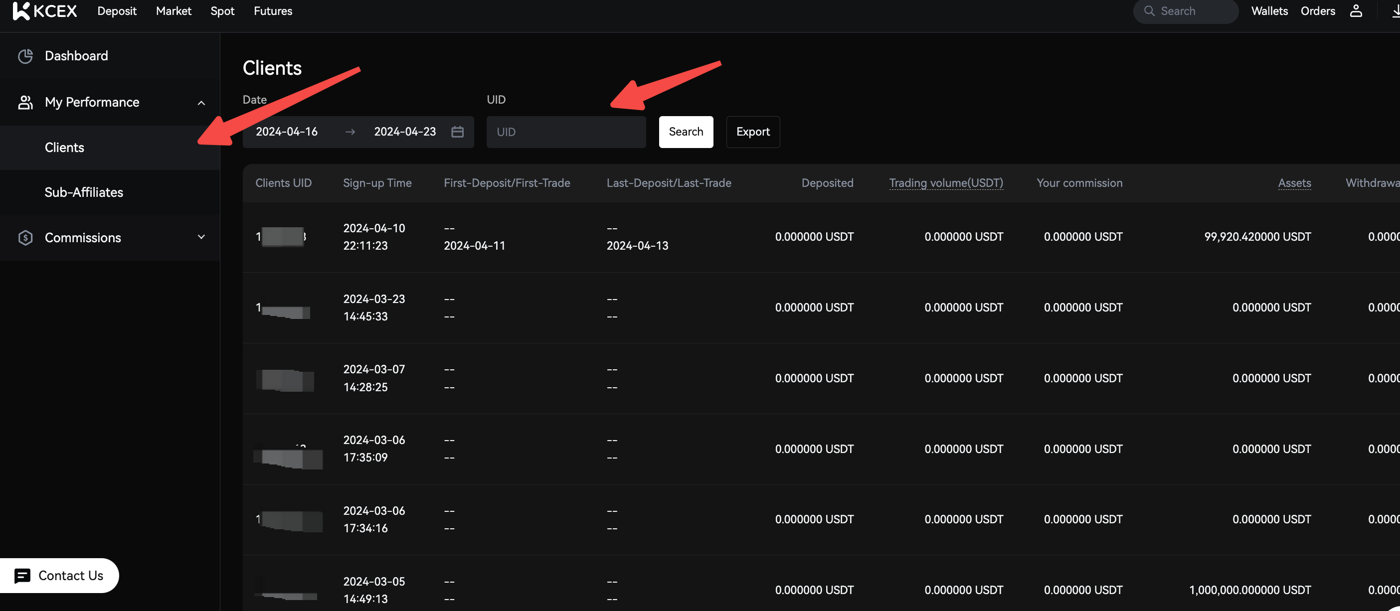 In the Client interface, you can review specific user data, including deposit and withdrawal amounts, generated commissions, and their trading volume. You can also see their current asset status. Additionally, you can use the account UID to quickly search for and access specific client details. Please note that the data in the Client interface is updated in real-time, ensuring you can always monitor and control the latest situation of your clients.