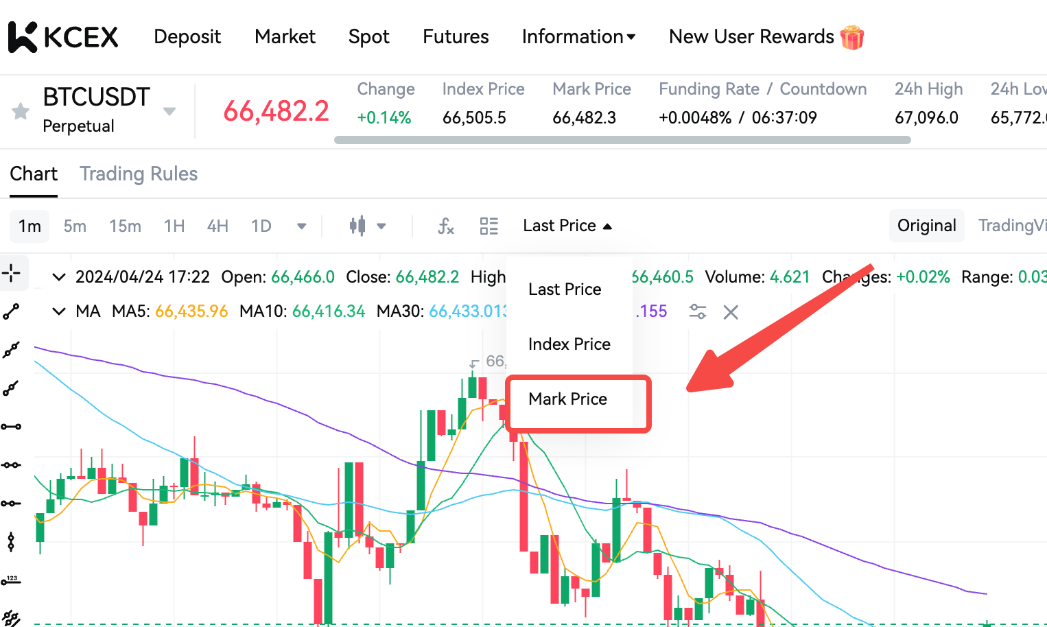 You can view the Mark Price on the KCEX website by selecting the [Mark Price] option above the K-line chart, allowing you to monitor your contract positions and market conditions more effectively.