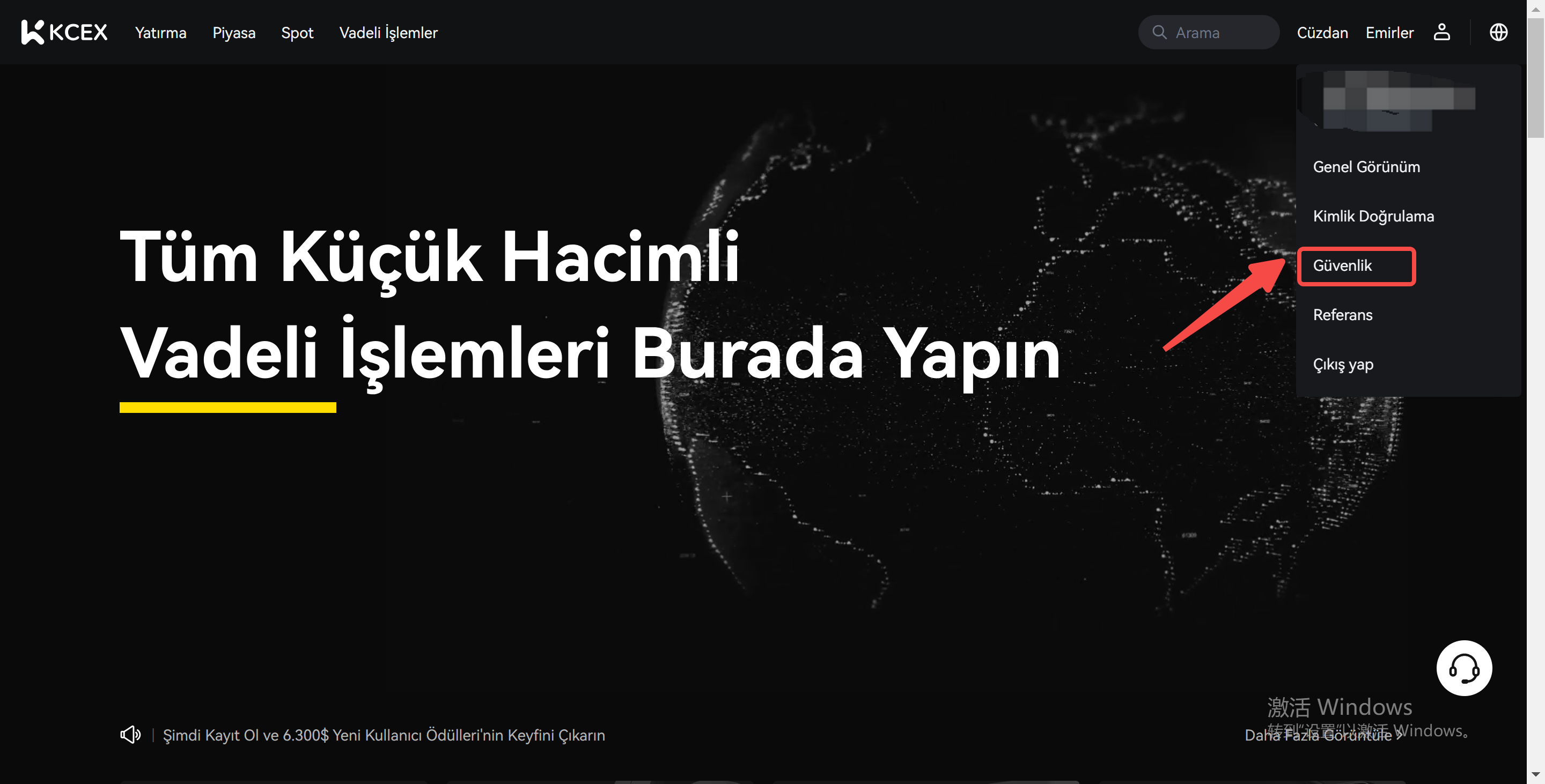 1. Resmi KCEX web sitesinde oturum açın, kullanıcı simgesinin üzerine gelin ve [Güvenlik] öğesine tıklayın.