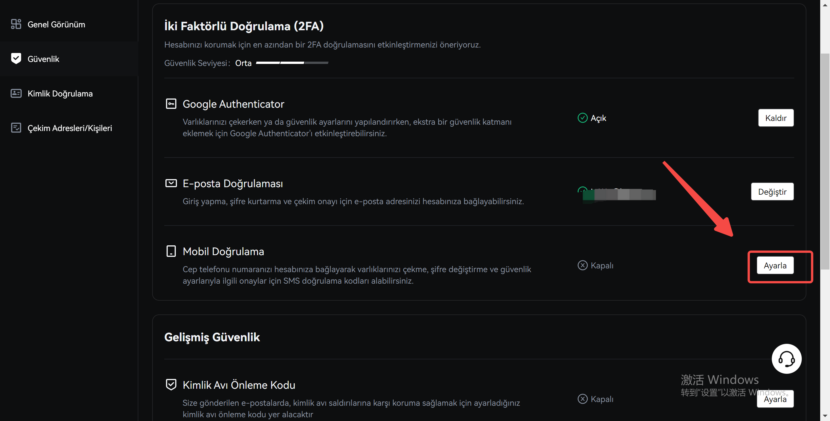 3. Güvenlik Merkezinde, [Mobil Bağla]'ya tıklayın.