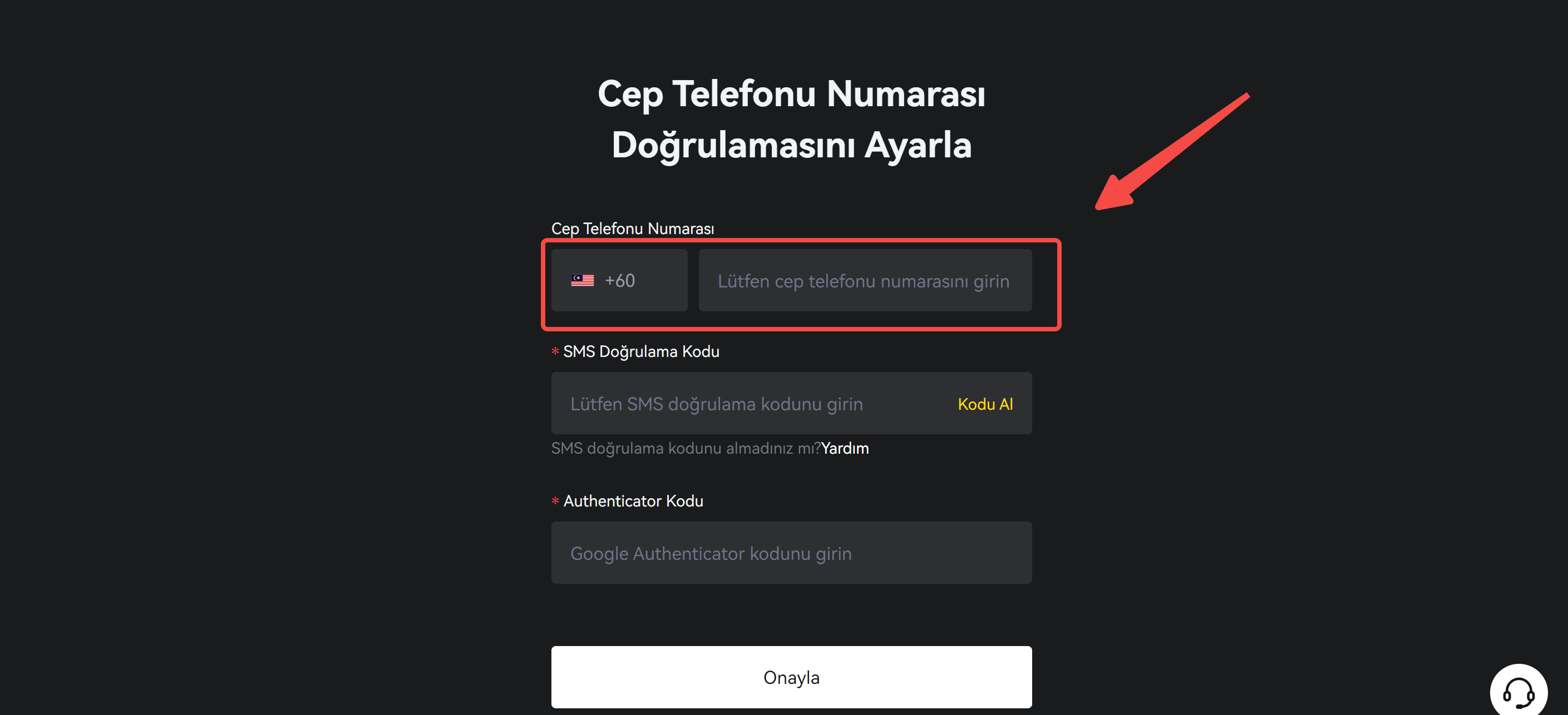 3. Ülke kodunu seçin ve cep telefonu numarasını, SMS doğrulama kodunu ve e-posta doğrulama kodunu/google doğrulama kodunu girin, ardından bağlantıyı tamamlamak için [Onayla]'yı tıklayın.