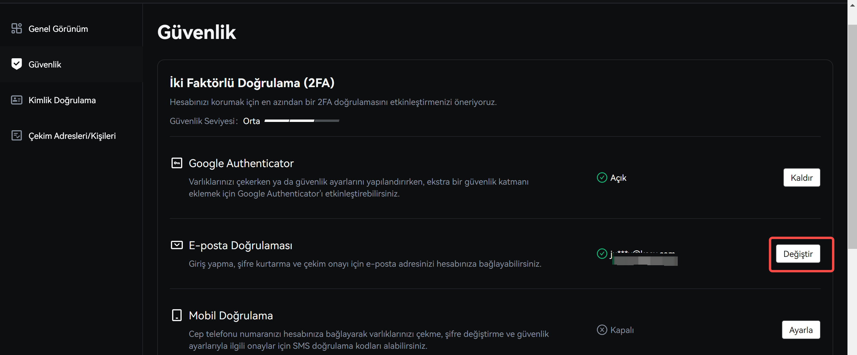 2. E-posta Doğrulaması bölümünde [Değiştir]i tıklayın.