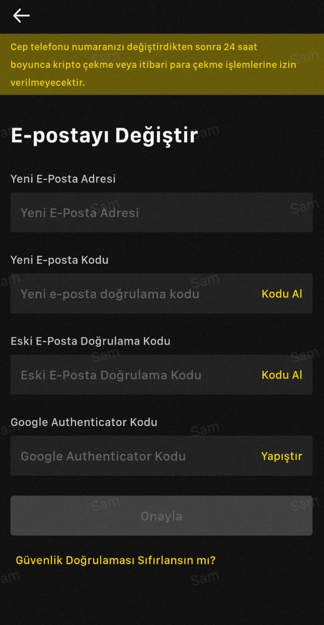 3. Yeni e-posta adresinizi, yeni e-posta doğrulama kodunuzu, eski e-posta doğrulama kodunuzu ve google doğrulama kodunuzu/sms doğrulama kodunuzu girin ve ardından değişiklik işlemini tamamlamak için [Onayla]'yı tıklayın.