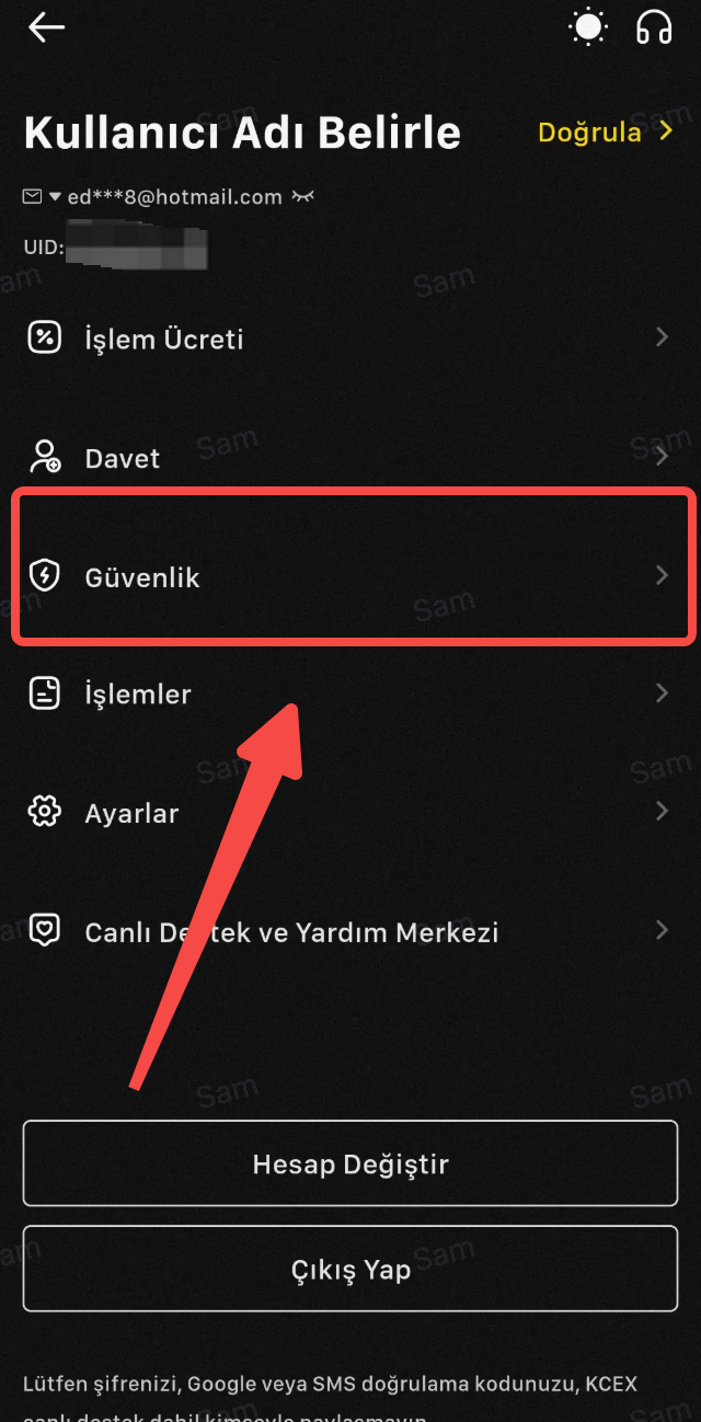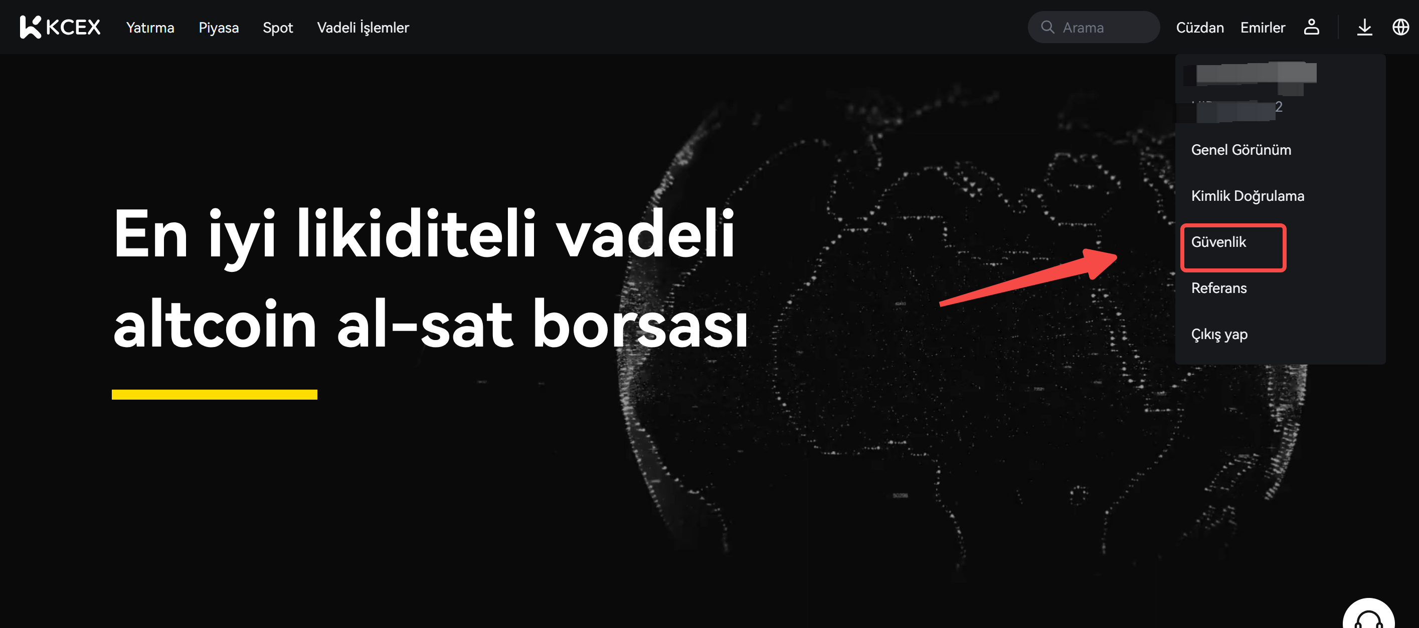 1. Resmi KCEX web sitesinde oturum açın, kullanıcı simgesinin üzerine gelin ve [Güvenlik] öğesine tıklayın.