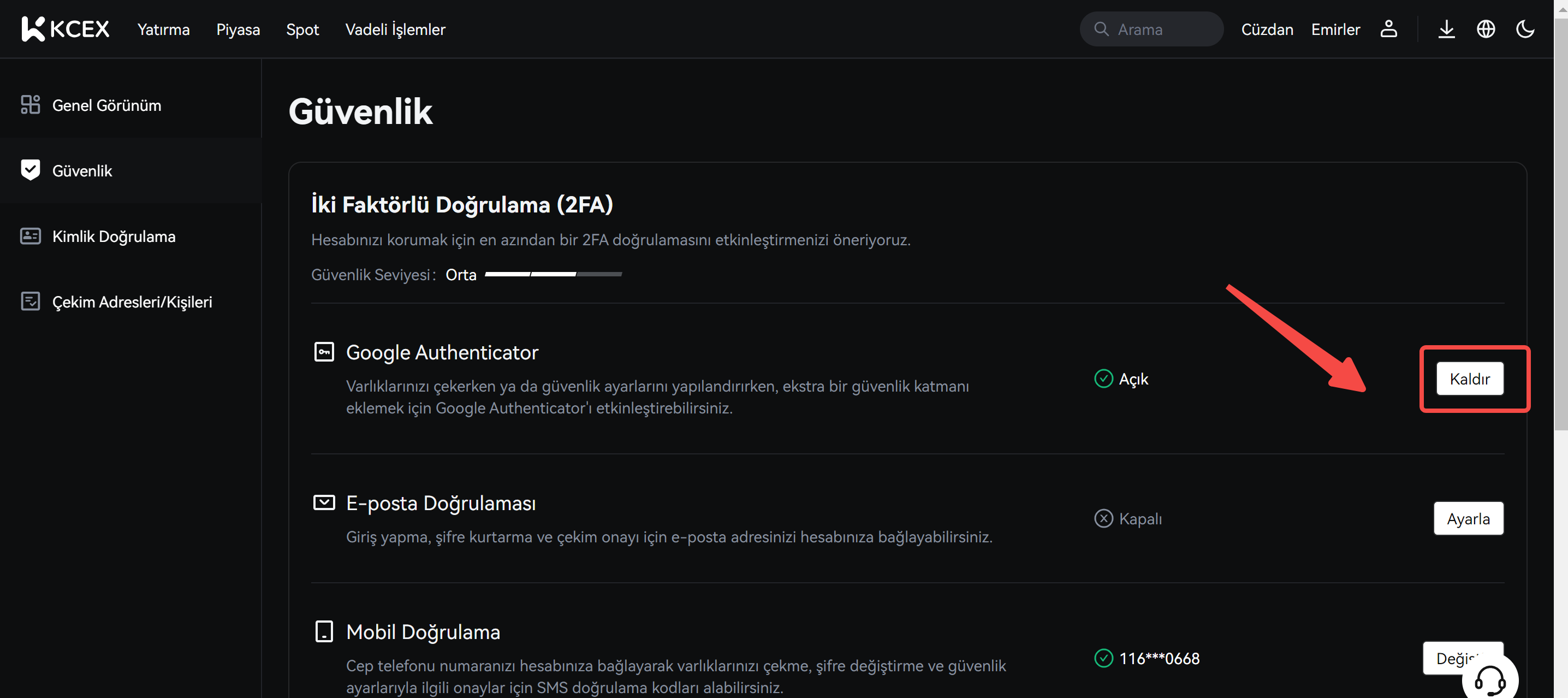 2. Google Authenticator bölümünde 'Kaldır'ı tıklayın.