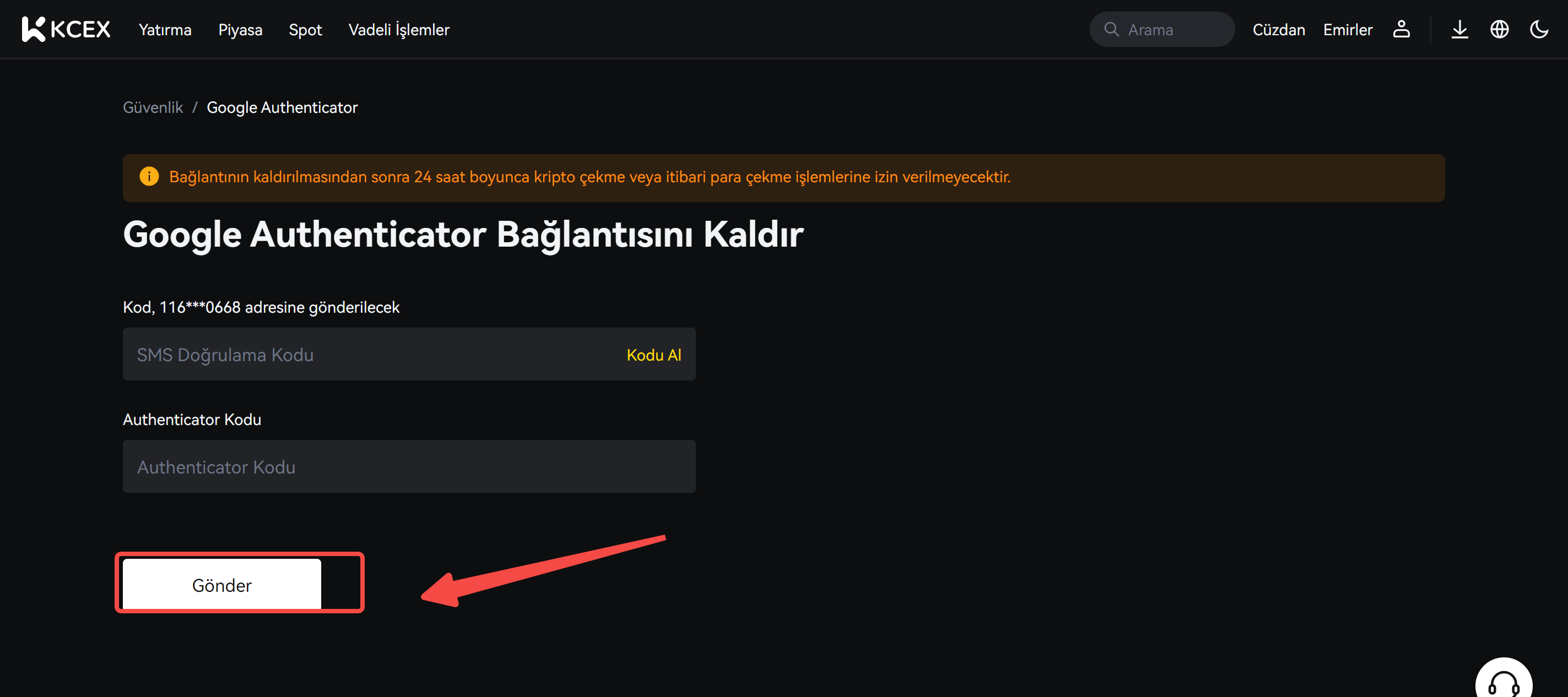 4. E-posta doğrulama kodunuzu / SMS doğrulama kodunuzu / Google doğrulama kodunuzu girin ve bağlantıyı kaldırma işlemini tamamlamak için "Gönder" butonuna tıklayın.
