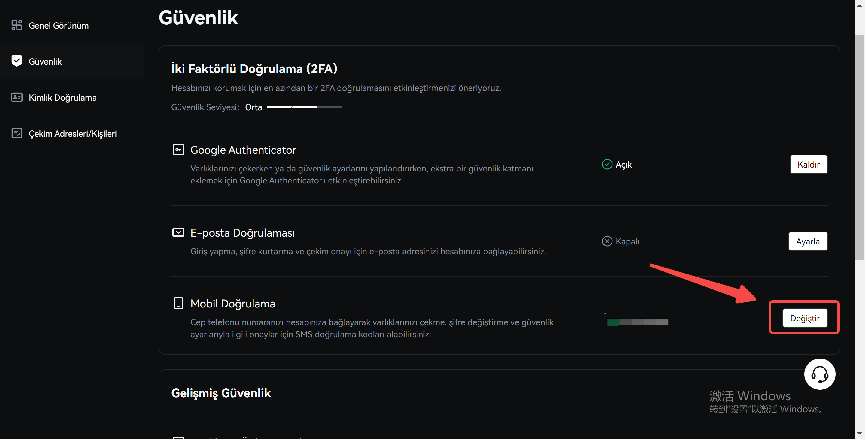 2. Mobil Doğrulama bölümünde [Değiştir]i tıklayın.