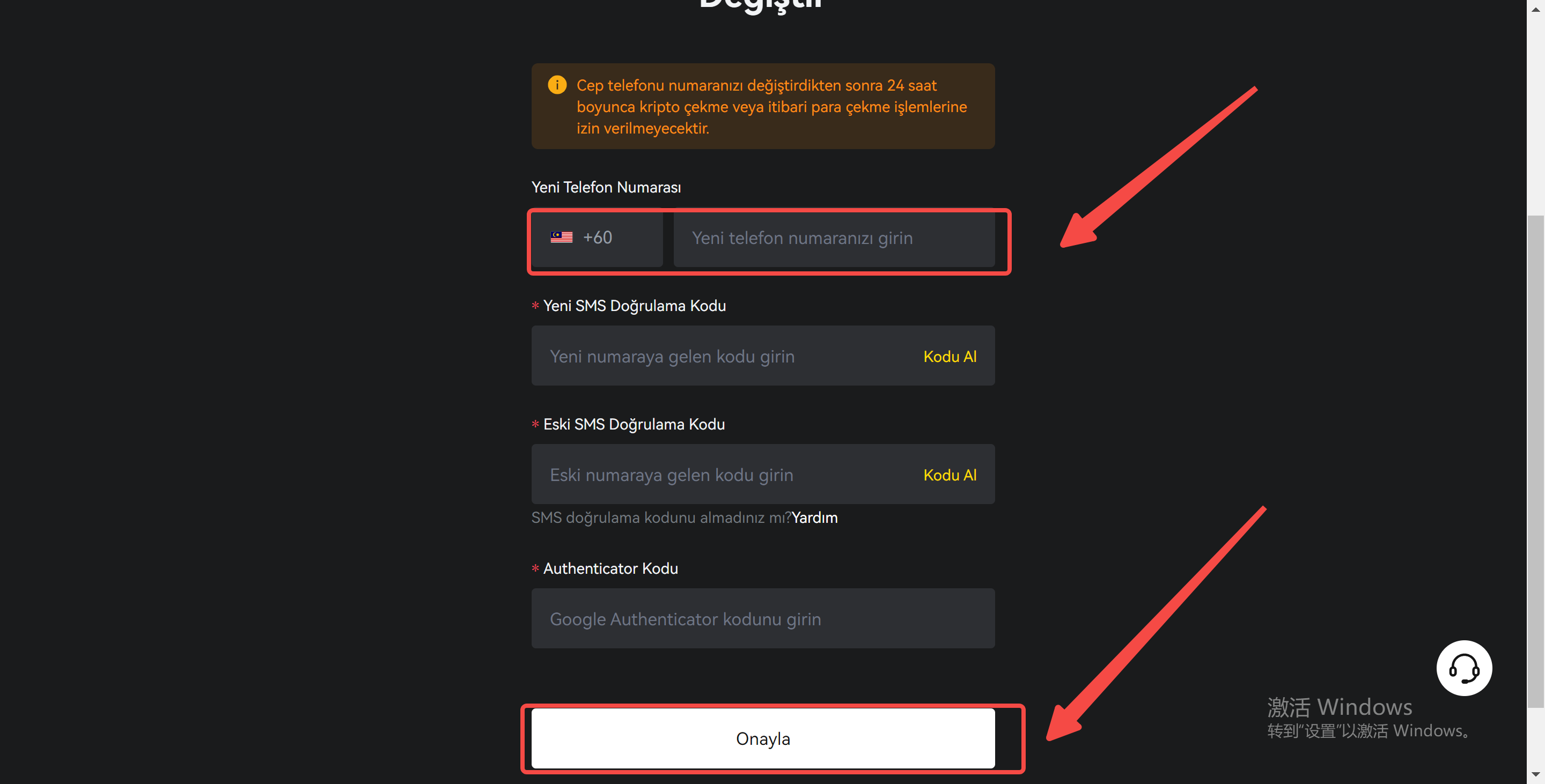 3. Ülke kodunu seçin ve cep telefonu numaranızı, yeni SMS doğrulama kodunu, önceki SMS doğrulama kodunu ve Google kimlik doğrulama kodunu girin. Son olarak değişiklik işlemini tamamlamak için [Onayla] öğesine tıklayın.
