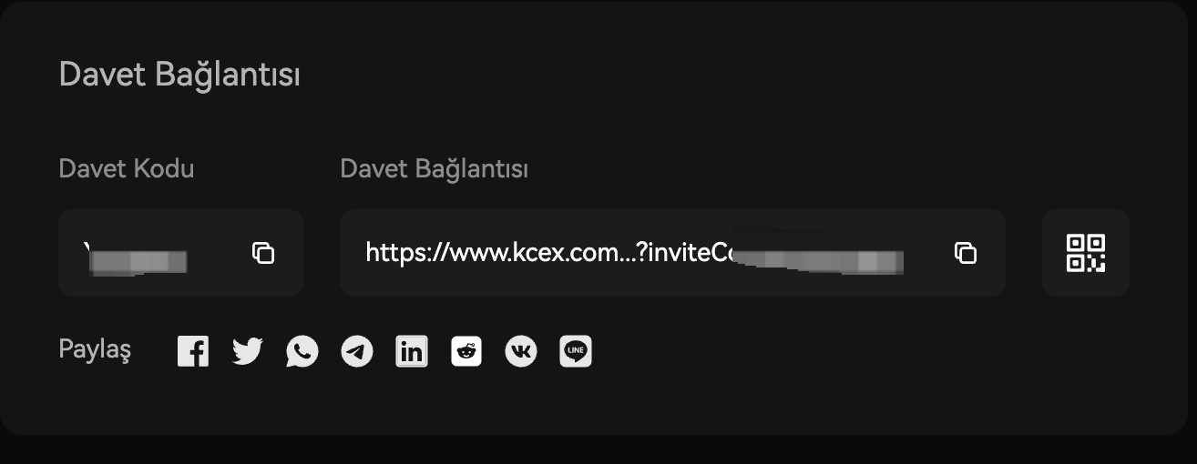 KCEX'te her kullanıcıya benzersiz bir davet kodu verilecektir. Arkadaşlarınızı platformumuza katılmaya davet etmek için varsayılan davet bağlantısını veya özel davet kodunuzu kullanabilirsiniz. Ek olarak, kolay paylaşım için arkadaşlarınızın kolayca taratıp kolayca katılabileceği ve birlikte alım satım eğlencesinin keyfini çıkarabileceği benzersiz bir QR kodu oluşturabilirsiniz.