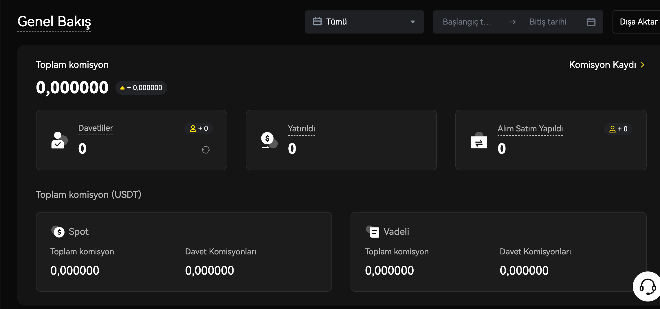 Bu alanda müşteri numaraları, depozitoları ve işlem verileri dahil olmak üzere komisyon durumunuzu kapsamlı bir şekilde görüntüleyebilirsiniz. Bu bilgiler, performans eğilimlerini izlemenize ve promosyon stratejilerinizi optimize etmenize yardımcı olacaktır. Ek olarak, ilgili verileri görüntülemek için sağ üst köşeden belirli tarihleri seçebilir ve bu verileri daha fazla analiz ve raporlama amacıyla kaydetmek için dışa aktarma işlevini kullanabilirsiniz.