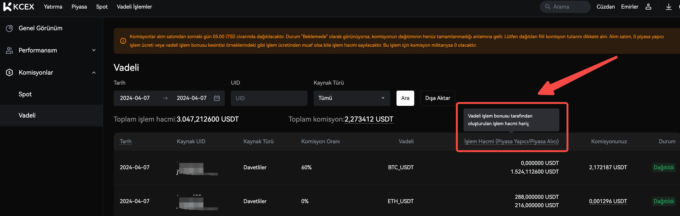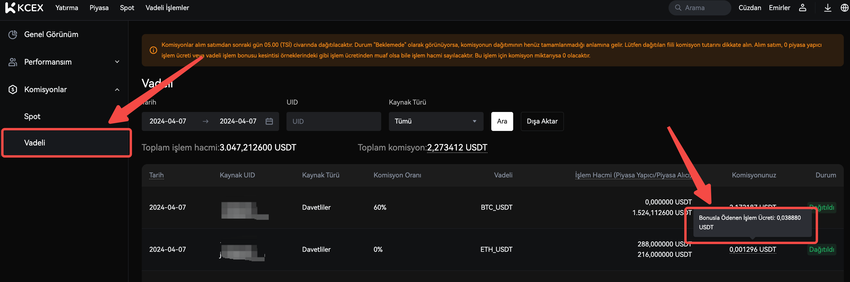 Komisyonlar işlem tamamlandıktan sonraki gün verilir. Durum "Beklemede" ise komisyon henüz dağıtılmamıştır; lütfen fiilen tahsis edilen komisyona bakın. Durum "Yayınlandı" ise komisyon zaten dağıtılmıştır. Komisyonlar, işlemden sonraki gün saat 05.00 civarında, dağıtıma bağlı olarak gerçek komisyon tutarıyla birlikte verilecektir.
