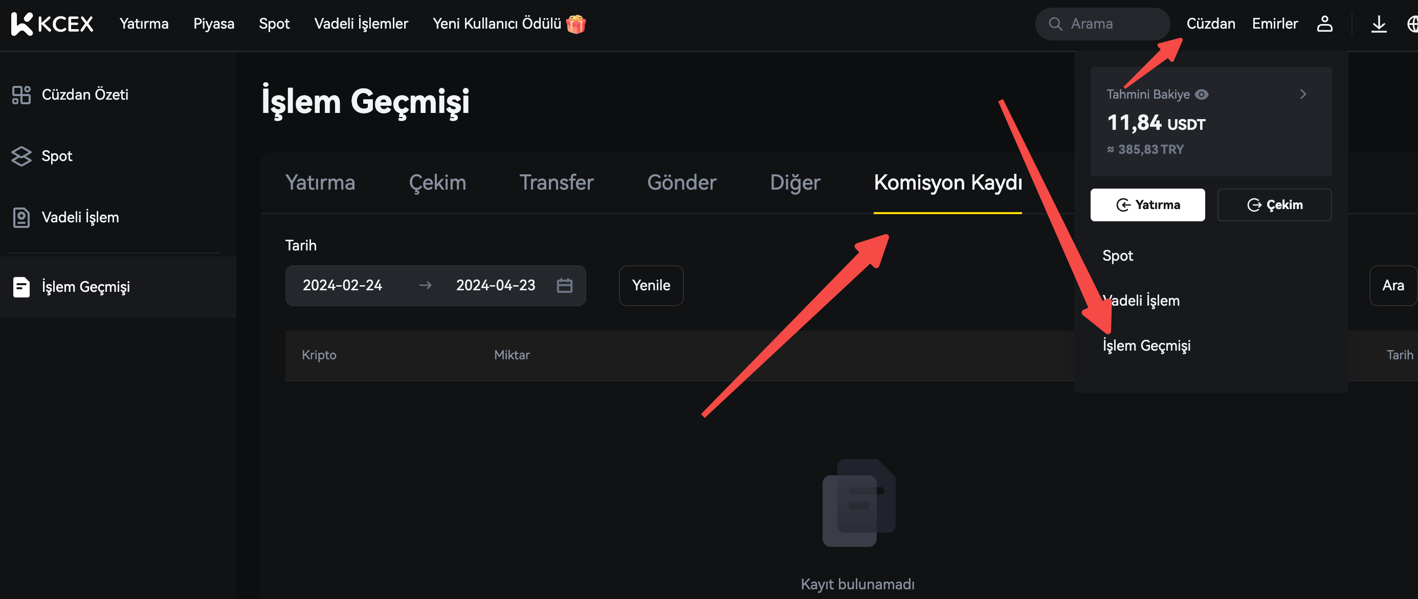 Ayrıca "Cüzdanlar" - "İşlem Geçmişi" - "Komisyon kayıtları" üzerinden komisyon akışınızı görüntüleyebilirsiniz.