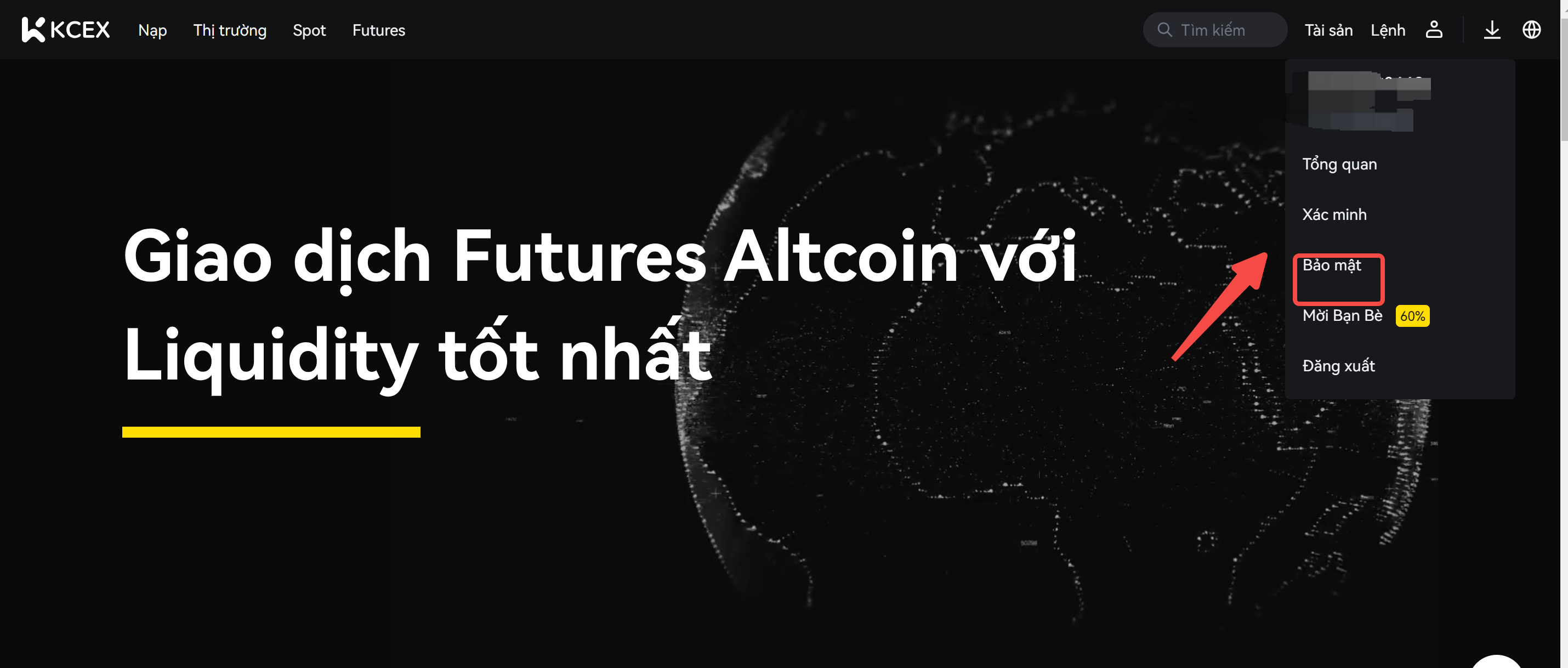 1. Đăng nhập vào trang web chính thức của KCEX, di chuột qua biểu tượng người dùng và nhấp vào [Bảo mật].