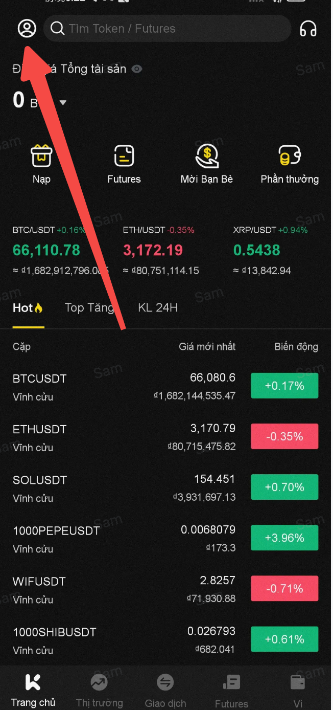1. Sau khi đăng nhập thành công vào ứng dụng, đi tới góc trên cùng bên trái của trang chủ và nhấp vào [Trung Tâm Cá Nhân].