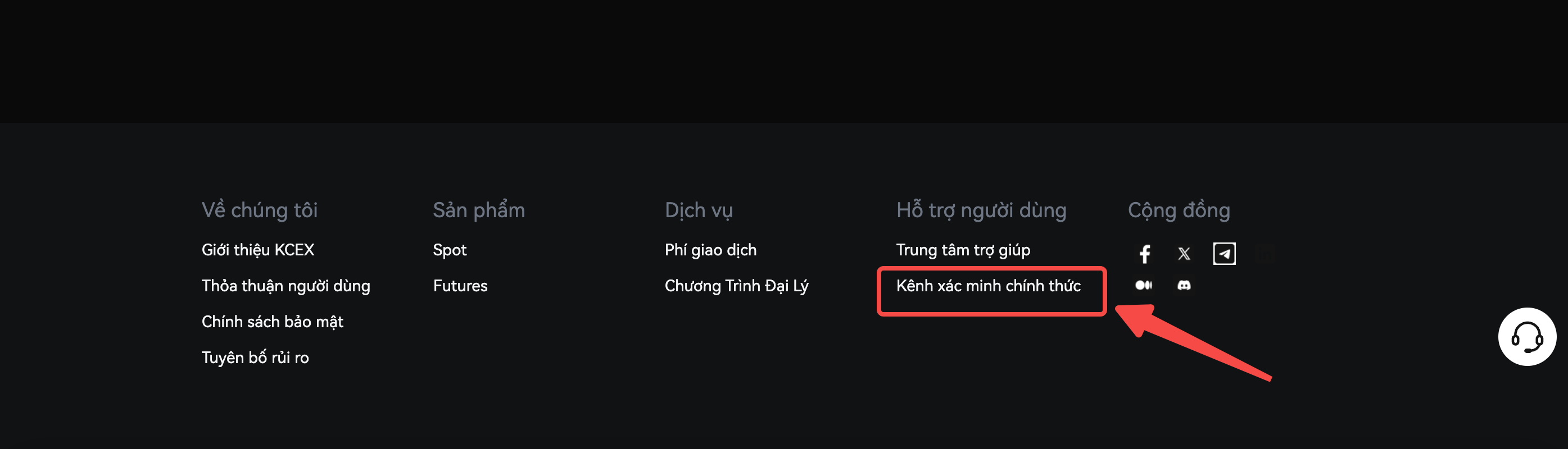 Bước 1: Truy cập trực tiếp https://www.kcex.com/official-verify, hoặc cuộn xuống dưới cùng của trang web và chọn "Hỗ trợ Người dùng" -"Kênh xác minh chính thức".