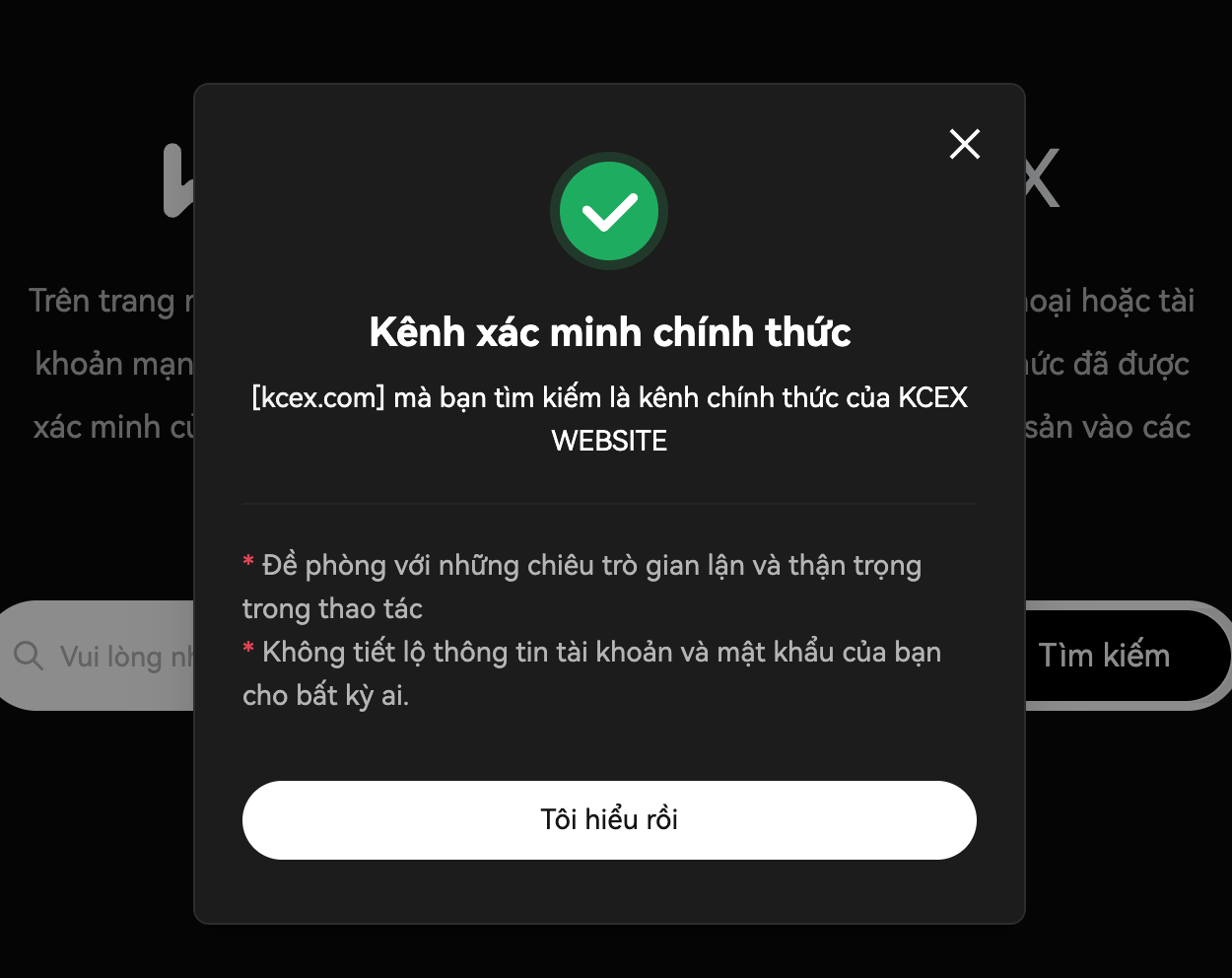 Sau khi truy vấn, nếu thông tin nhập vào là thông tin chính thức của KCEX, một cửa sổ pop-up sẽ hiển thị như sau: