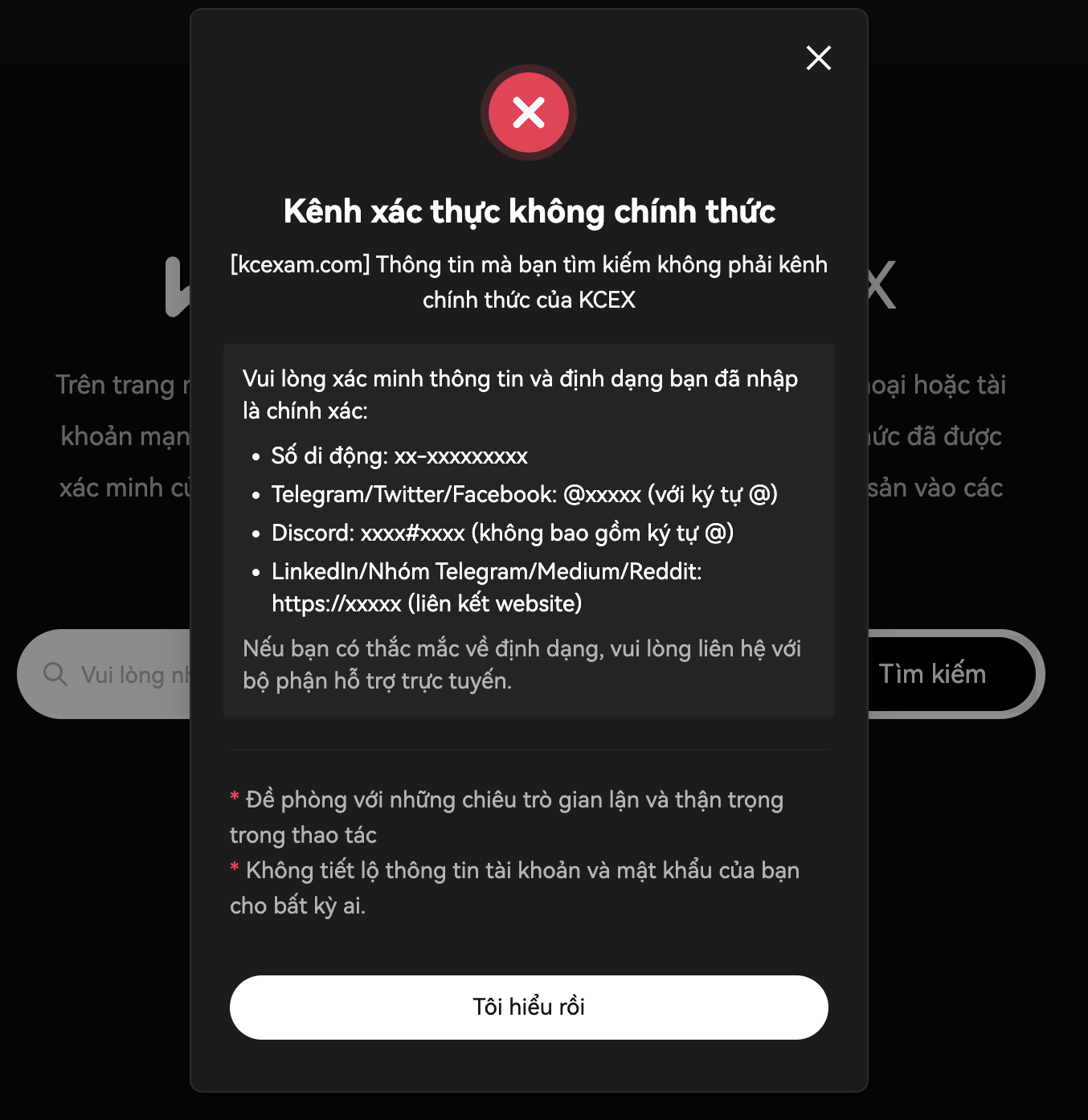Sau khi truy vấn, nếu thông tin nhập vào không phải là thông tin chính thức của KCEX, một cửa sổ pop-up sẽ hiển thị như sau: