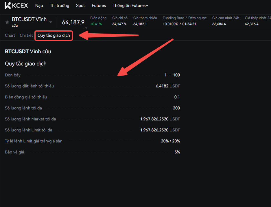 Trong giao diện giao dịch tương lai, bạn có thể xem thông số kỹ thuật cho cặp giao dịch tương ứng trong ký hiệu hướng dẫn bên phải. Tùy thuộc vào điều kiện rủi ro thị trường, KCEX có thể điều chỉnh các thông số kỹ thuật của cặp giao dịch, bao gồm tỷ lệ tài trợ, biến động giá tối thiểu, đòn bẩy tối đa, marjin ban đầu, marjin duy trì và các thông số quan trọng khác.