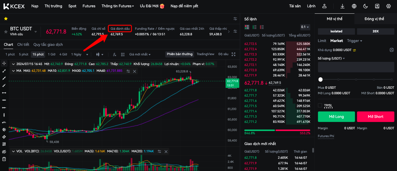 Bạn có thể xem Giá Đánh Dấu trên website KCEX bằng cách chọn tùy chọn [Giá Đánh Dấu] phía trên biểu đồ K-line, cho phép bạn theo dõi các vị thế Futures và điều kiện thị trường một cách hiệu quả hơn.