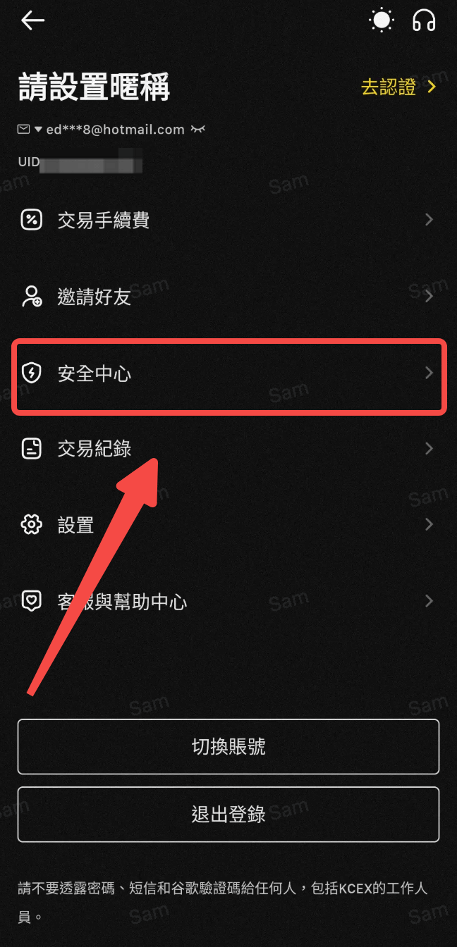 1. 登入官方KCEX網站,懸停在用戶圖示上,點擊[安全中心]。