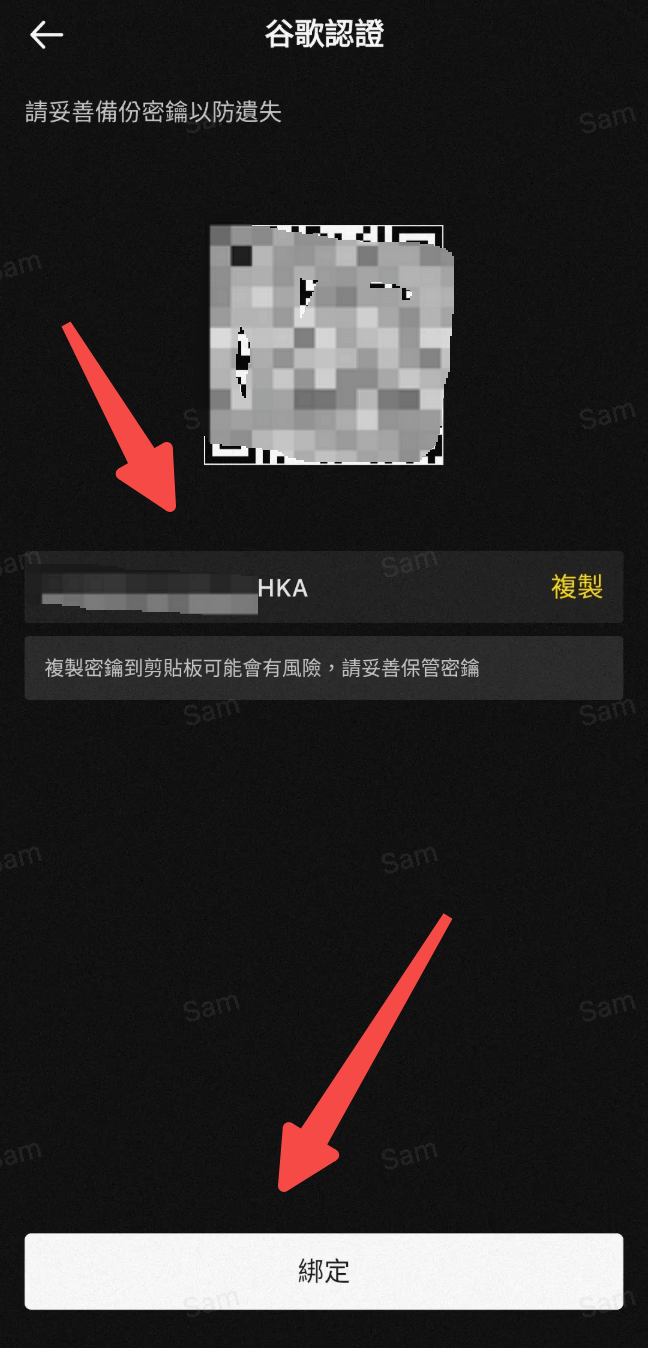 5. 打開身份驗證器應用,掃描顯示在頁面上的QR碼,或者複製並貼上密鑰以生成驗證碼。請務必保存此密鑰,以便在更換或遺失手機時能夠恢復谷歌身份驗證器。