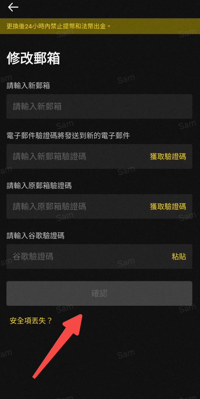 填寫您的新郵箱地址、新郵箱驗證碼、舊郵箱驗證碼以及谷歌驗證碼/短信驗證碼,然後點擊以完成更改流程。