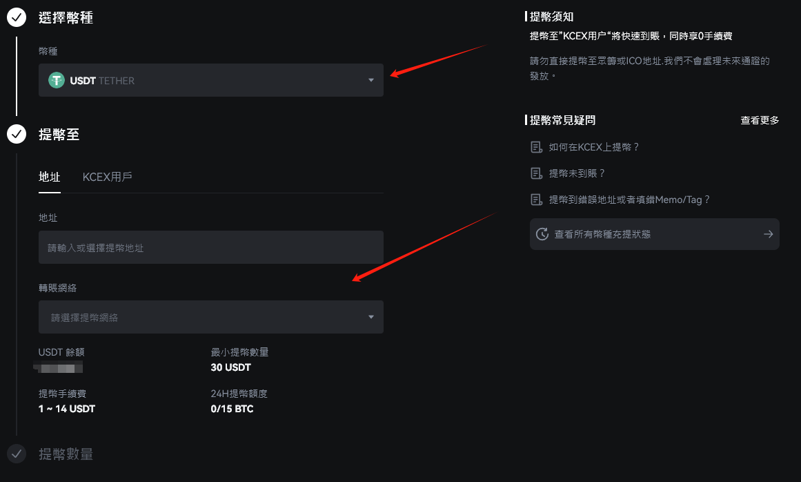 2. 選擇您要提幣的幣種與提幣網絡,並填寫提幣地址。(注意您選擇的提幣網絡,是否和您接收地址網絡保持一致)