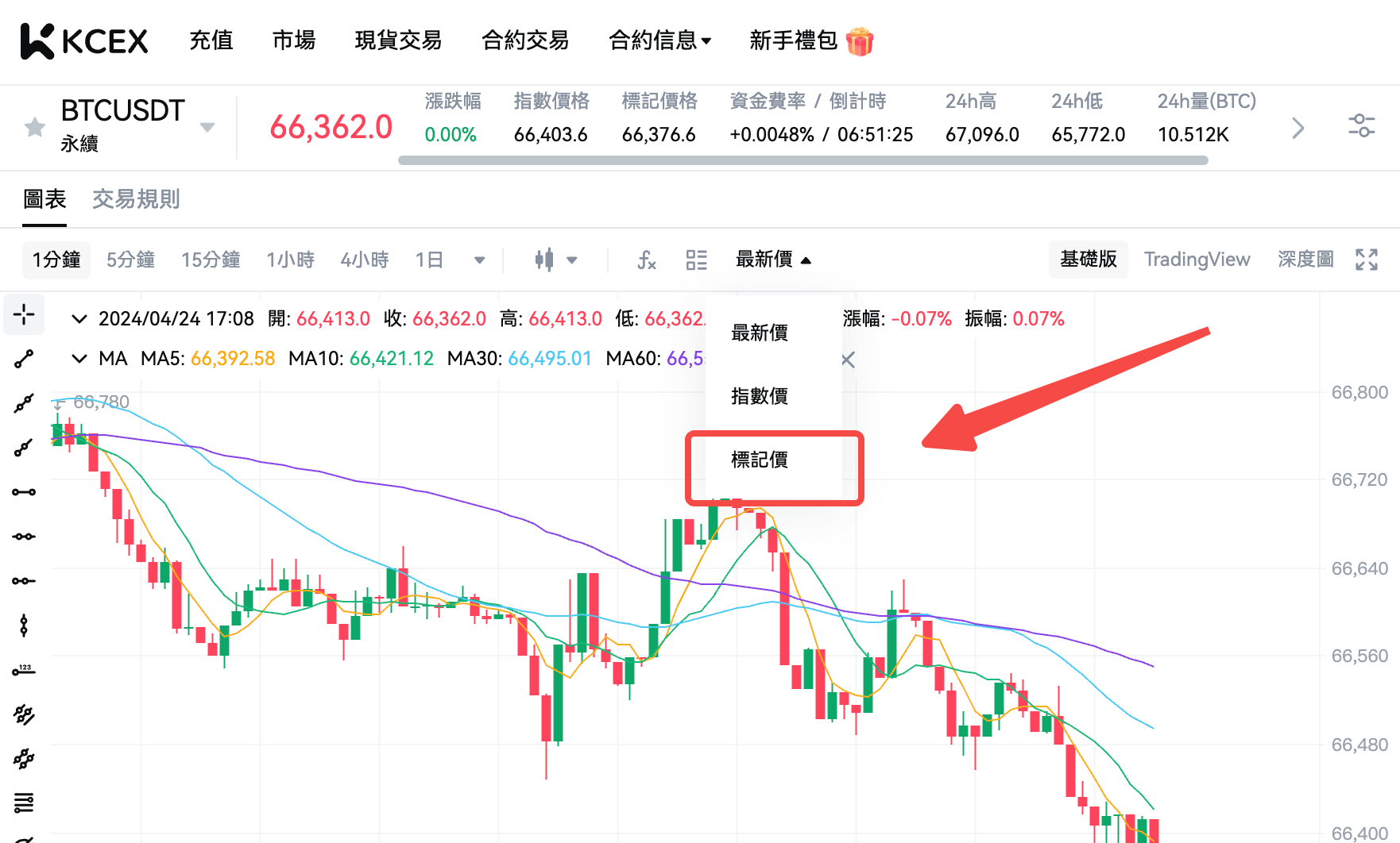 您可以在KCEX網頁端的K線圖上方選擇「標記價」選項,查看標記價格的K線圖,從而更好地監控您的合約位置和市場狀況。